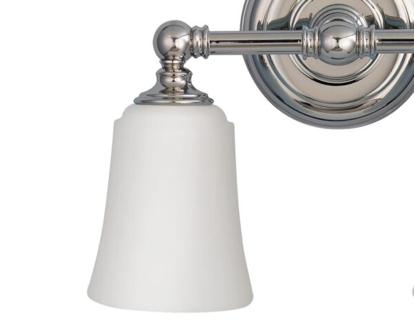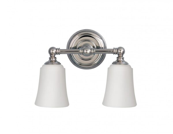 Kinkiet z kolekcji Huguenot Lake wykończony w kolorze polerowanego chromu, posiada dwa klosze z dymnego szkła w kształcie kielicha. Szerokość lampy wynosi 33 cm a wysokość 24,8 cm. Najdalej wysunięta część znajduje się w odległości 15,2 cm od ściany. Odpowiedni do żarówek LED G9 3,5W (w zestawie). Lampa została wyposażona w system ochrony przed zanieczyszczeniami i zamoczeniem oznaczony symbolem IP44. Przewidywany czas realizacji ok. 2 tygodnie. W związku z tym, że produkt jest wykonywany i sprowadzany pod indywidualne zamówienie, klientowi nie przysługuje 14-dniowe prawo do odstąpienia od umowy.