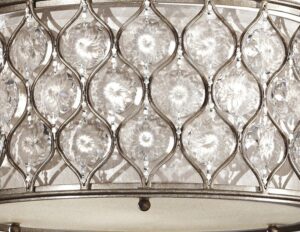Plafon z kolekcji Lucia posiada metalową konstrukcję w kolorze opalonego srebra oraz trzy źródła światła ukryte za podwójnym kloszem. Abażur składa się z dwóch części: spodnia z materiału, wierzchnia z kryształków zaczepionych do metalowej ramy. Wpisze się doskonale w bogate a zarazem eleganckie stylizacje Glamour. Średnica lampy wynosi 40,6 cm, natomiast wysokość konstrukcji to 31,8 cm. Odpowiednia do żarówek o max. mocy 60W każda, gwint E27. Przewidywany czas realizacji ok. 2 tygodnie. W związku z tym, że produkt jest wykonywany i sprowadzany pod indywidualne zamówienie, klientowi nie przysługuje 14-dniowe prawo do odstąpienia od umowy.