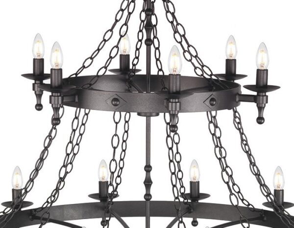 Żyrandol z serii Warwick w kolorze grafitowym. Średnica lampy wynosi 122 cm, natomiast wysokość konstrukcji 97 cm. Długość żyrandola można regulować i kształtuje się od 104 cm do 597 cm. Odpowiednia do żarówek 60W E14. Przewidywany czas realizacji ok. 2 tygodnie. W związku z tym, że produkt jest wykonywany i sprowadzany pod indywidualne zamówienie, klientowi nie przysługuje 14-dniowe prawo do odstąpienia od umowy.