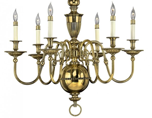 Żyrandol posiada odlewane, mosiężne elementy, zawiera sześć punktów świetlnych. Średnica żyrandola wynosi 72,4 cm, wysokość 67,3 cm. Lampa posiada regulację na przewodzie od 81 cm do 229,5 cm. Źródło światła: 6x 60W E14. Przewidywany czas realizacji ok. 2 tygodnie. W związku z tym, że produkt jest wykonywany i sprowadzany pod indywidualne zamówienie, klientowi nie przysługuje 14-dniowe prawo do odstąpienia od umowy.